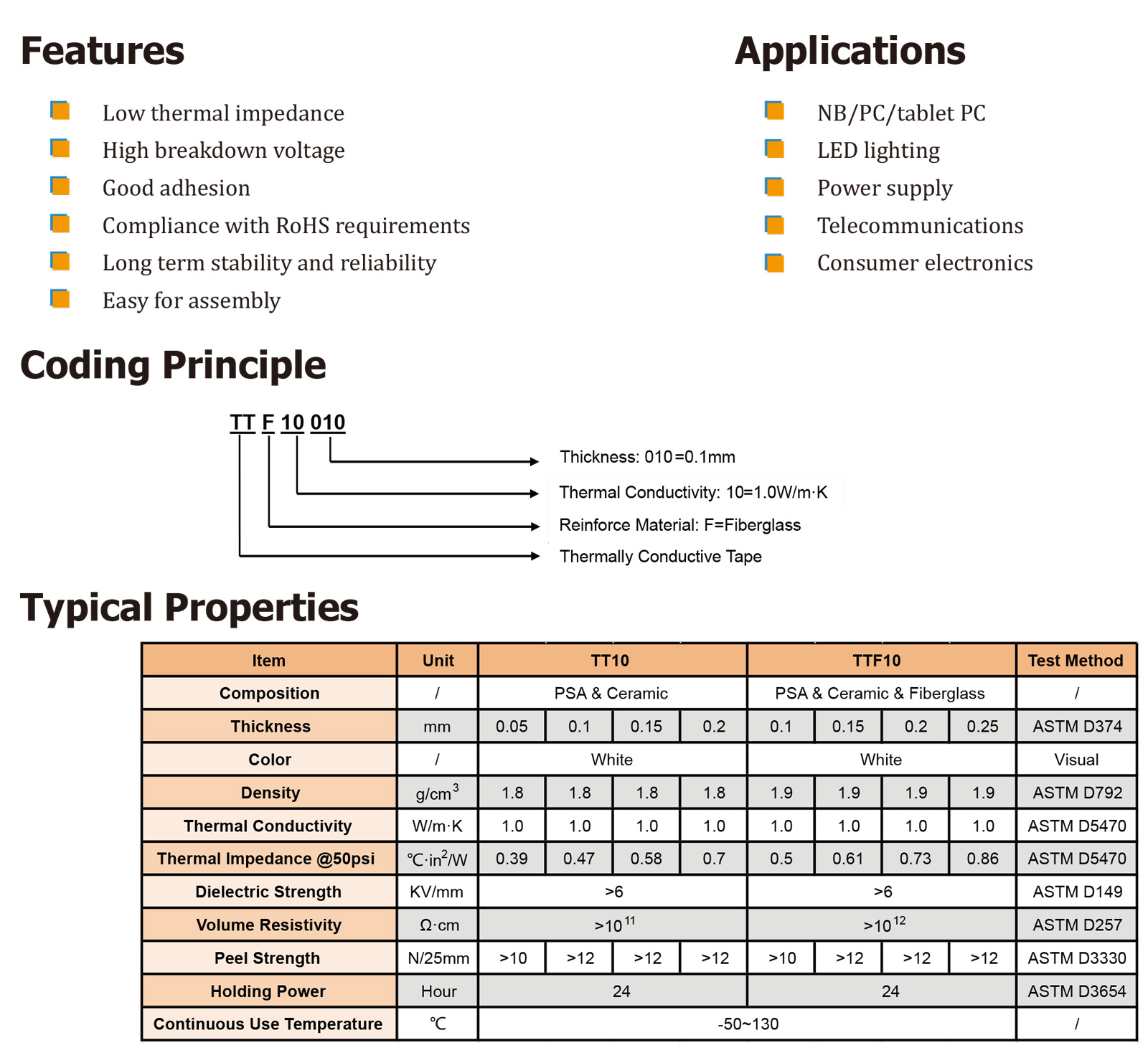 TT系列導(dǎo)熱膠帶是一種用高導(dǎo)熱陶瓷填料填充的丙烯酸類壓敏膠。TT系列由于其良好的導(dǎo)熱性,改善了發(fā)熱元件和散熱器之間的熱傳導(dǎo)。具有優(yōu)異的粘合性能和較低的耐熱性,可以取代熱油脂和機(jī)械固定方法。