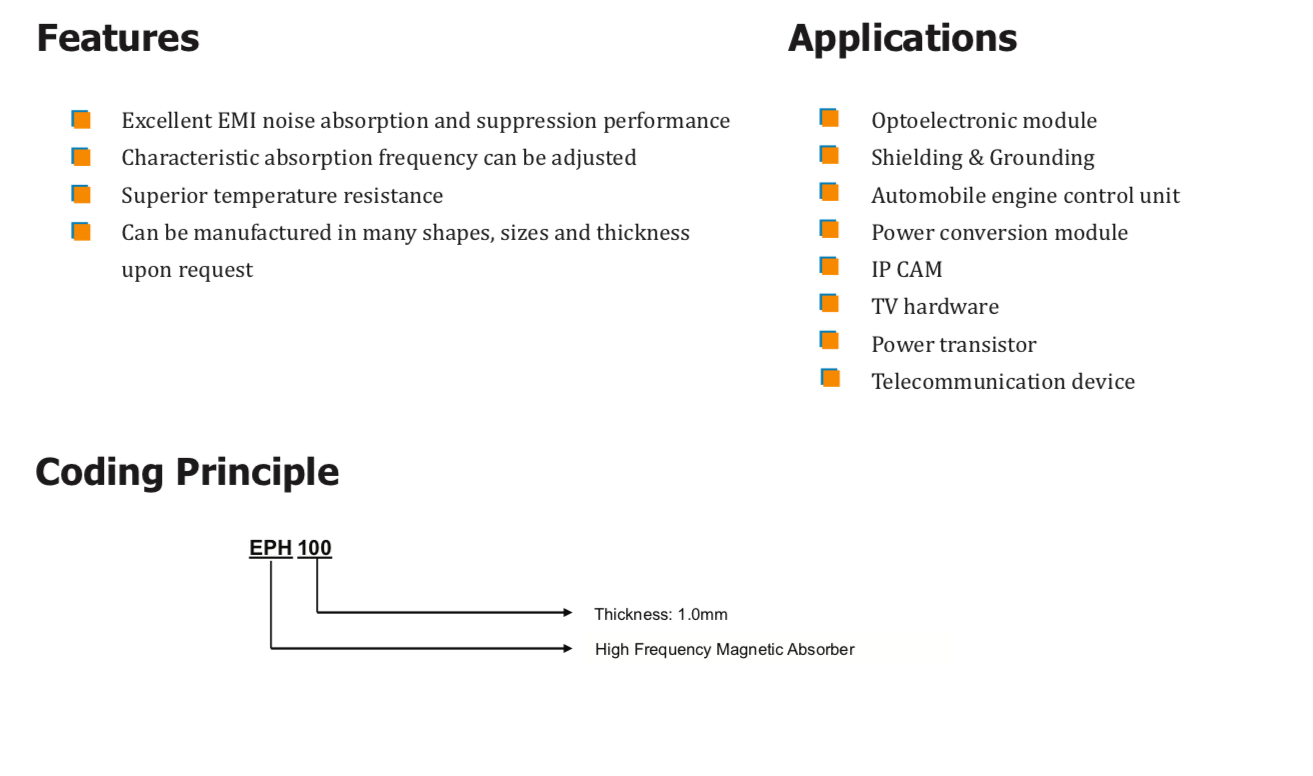 TM EPH系列是一種由高磁導(dǎo)率合金粉末和橡膠混合、分散、壓制而成的高頻吸收材料。該材料可以通過絕緣損耗、磁損耗和阻抗損耗將電子設(shè)備發(fā)射的電磁波轉(zhuǎn)化為熱能來減少電磁輻射。" />